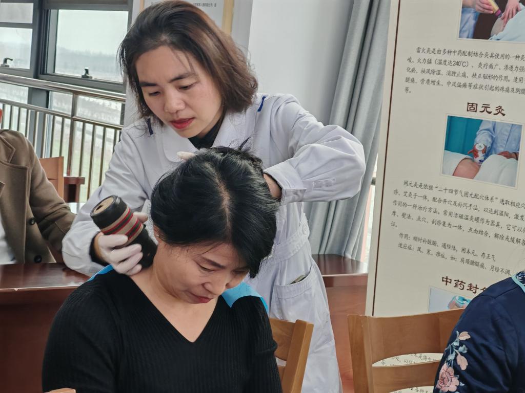 宿迁市中医院中医主管护师沈雪为参加活动的职工做中医适宜技术体验治疗,针对不同病症为在场职工提供贴耳穴、艾灸、推拿等中医适宜技术治疗。沈雪说:“肩颈处与身体多个脉络相通,牵一发而动全身,艾灸治疗可以缓解疼痛感和酸胀感,如果能加上合理的运动,例如:八段锦和太极,让身体得到合理锻炼,效果往往会事半功倍。”