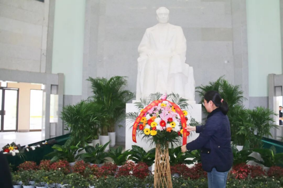 在周恩来纪念馆,党员干部向周总理汉白玉座像敬献花篮。党委委员、副院长刘艳芳代表党员干部整理挽联。