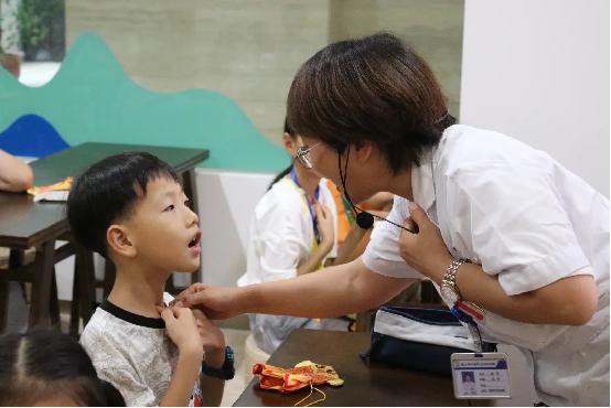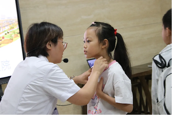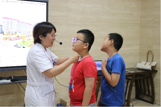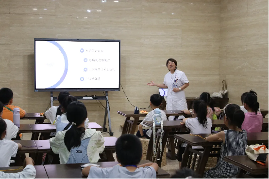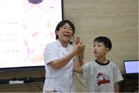 参观结束后,宿迁市中医院儿科副主任中医师朱利为孩子们带来了一场别开生面的中医讲座。正值三伏时节,朱医师生动讲解了"冬病夏治"的中医理念,通过动画演示将《黄帝内经》"春夏养阳"理论转化为易懂的生活常识。现场,孩子们跟随朱医师学习"天突、膻中"等五大要穴定位,亲身体验"合谷穴缓解头晕"的神奇效果。最令人兴奋的是"三伏贴初体验"环节,孩子们在指导下将温阳药贴精准敷于天突穴,切身感受传统中医的魅力。