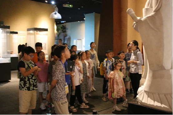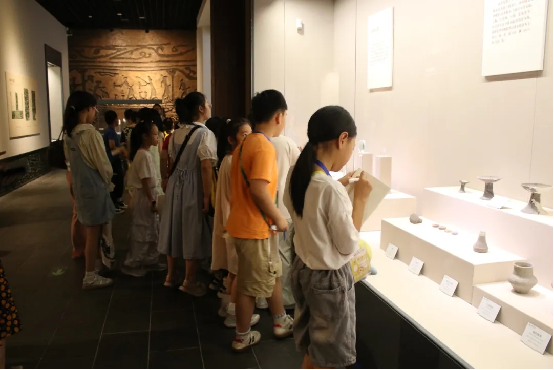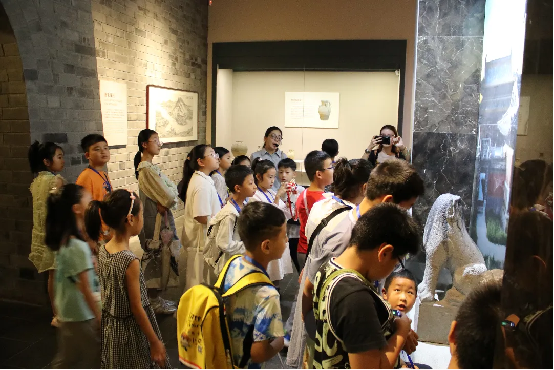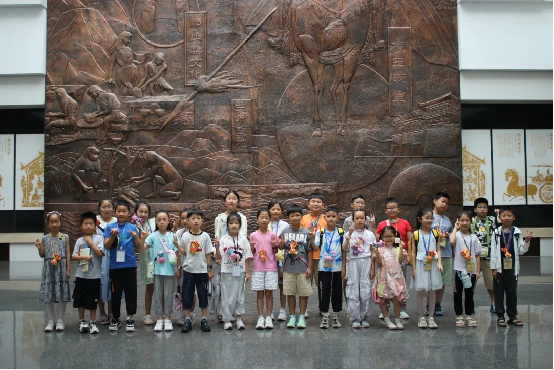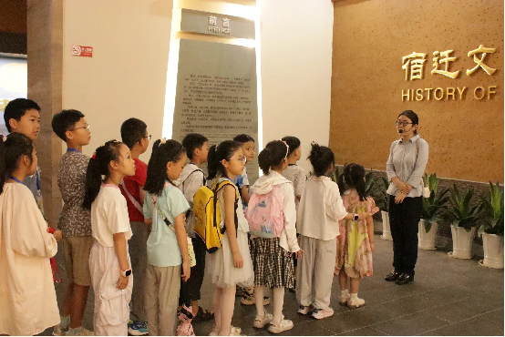 活动伊始,孩子们在博物馆讲解员的带领下,开启了一场穿越时空的文化之旅。作为西楚霸王项羽的故里,宿迁有着8000多年的文明史。从顺山集文化遗址出土的新石器时代文物,到见证漕运繁华的清代乾隆行宫;从项王故里的英雄传奇,到皂河古镇的运河记忆,每一件展品都在诉说着这座古城的故事。讲解员介绍,宿迁不仅是"项羽故里",更是著名的"酒都",洋河、双沟的酿酒技艺传承至今已有两千多年历史。孩子们还了解到,宿迁作为革命老区,刘少奇、陈毅、彭雪峰、朱瑞等老一辈革命家曾在此战斗生活,留下了宝贵的红色记忆。