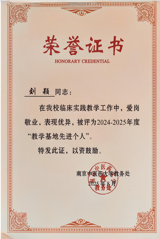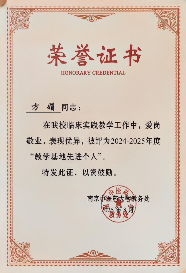 日前,南京中医药大学中医类专业临床教学师资培训班举行2024-2025年度教学表彰活动。我院方娟和刘颖两位同志在临床实践教学工作中表现优异被南京中医药大学教务处评为2024-2025年度“教学基地先进个人”。