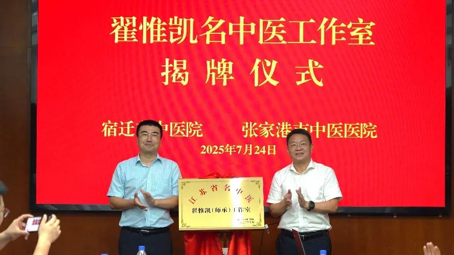 张家港市中医医院党委书记强胜与宿迁市中医院党委副书记、副院长陈华共同为工作室揭牌。