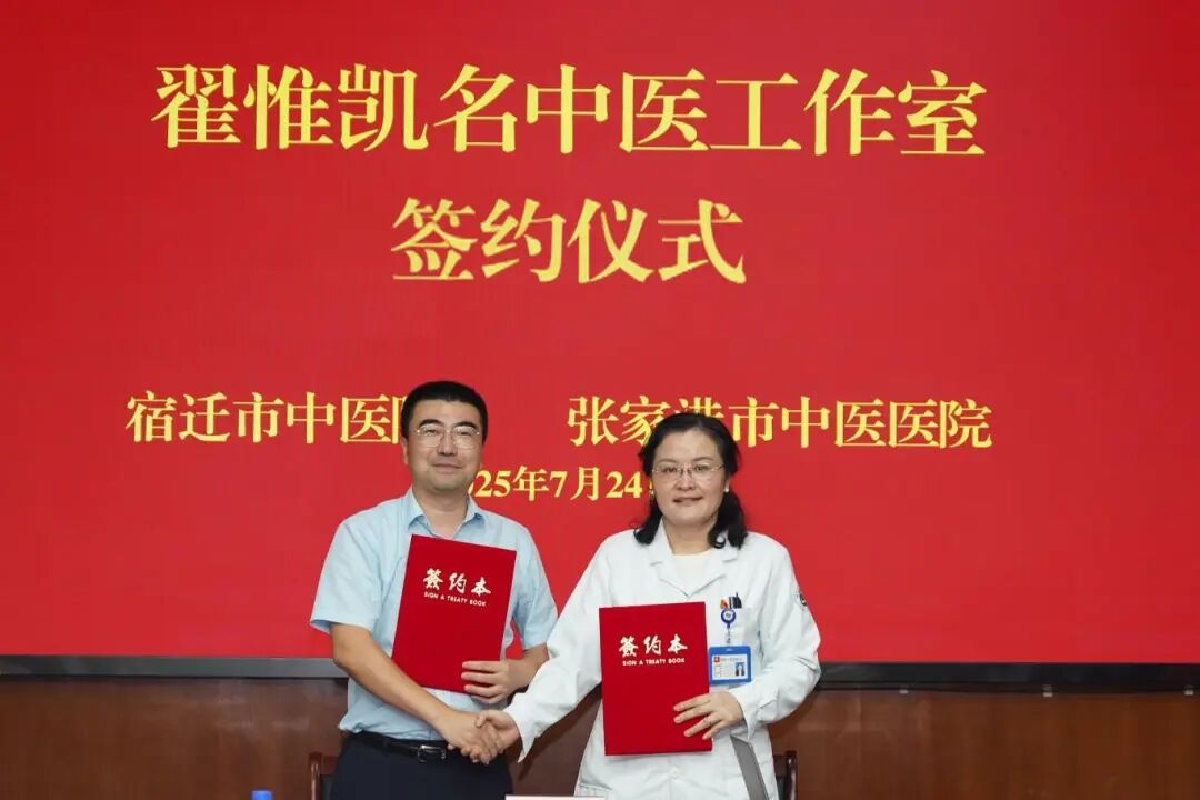 仪式上,张家港市中医医院党委副书记、院长王利红与宿迁市中医院党委副书记、副院长陈华共同签订工作室合作协议。