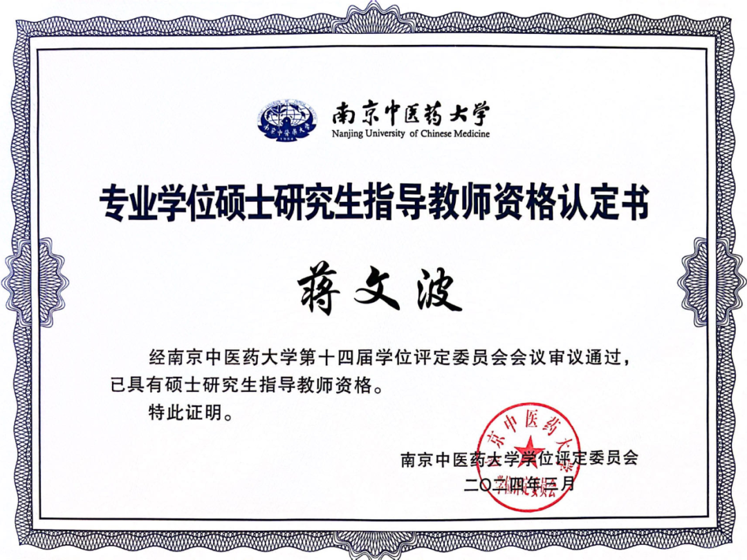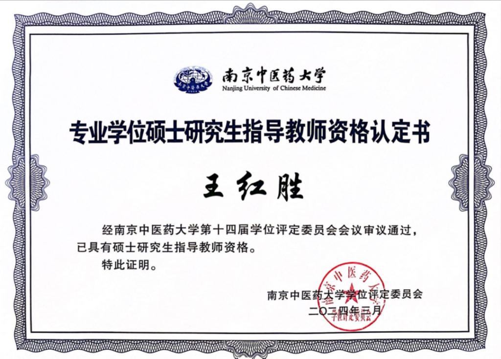 根据南京中医药大学《关于开展2023年研究生指导教师遴选工作的通知》要求,经过个人申请、培养单位审核、学位评定分委员会推荐、学位评定委员会办公室组织审核、学位评定委员会会议审议等程序,市中医院脑病科执行主任、主任中医师王红胜,心血管科副主任中医师蒋文波被增列为南京中医药大学专业硕士研究生导师。